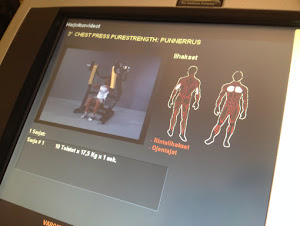 Tenkkapoo iskikin sitten, kun varsinkin vapaat painot tai jalkaprässin painot olisi pitänyt koneelle syöttää niin että ne vastasivat oikeaa suoritusta. Painopakkalaitteilla homma hoituu näppärästi nuolinäppäimillä suorituksen ohessa, mutta kosketusnäytöllä jälkikäteen tehden homma tuntui mahdottomalta. Löysin homman jujun vasta toisella salikerralla, joten ekan kerran painot jäivät "neitipainoiksi" myös harjoitushistoriaan. Oli se silti ihanaa, että historiatietojen mukaan olin ylisuorittanut jokaisen harjoitteen.